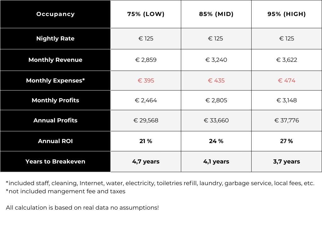 *Return on investment based on a nightly rate of $125 and 85% occupancy (tax and management fee not included)